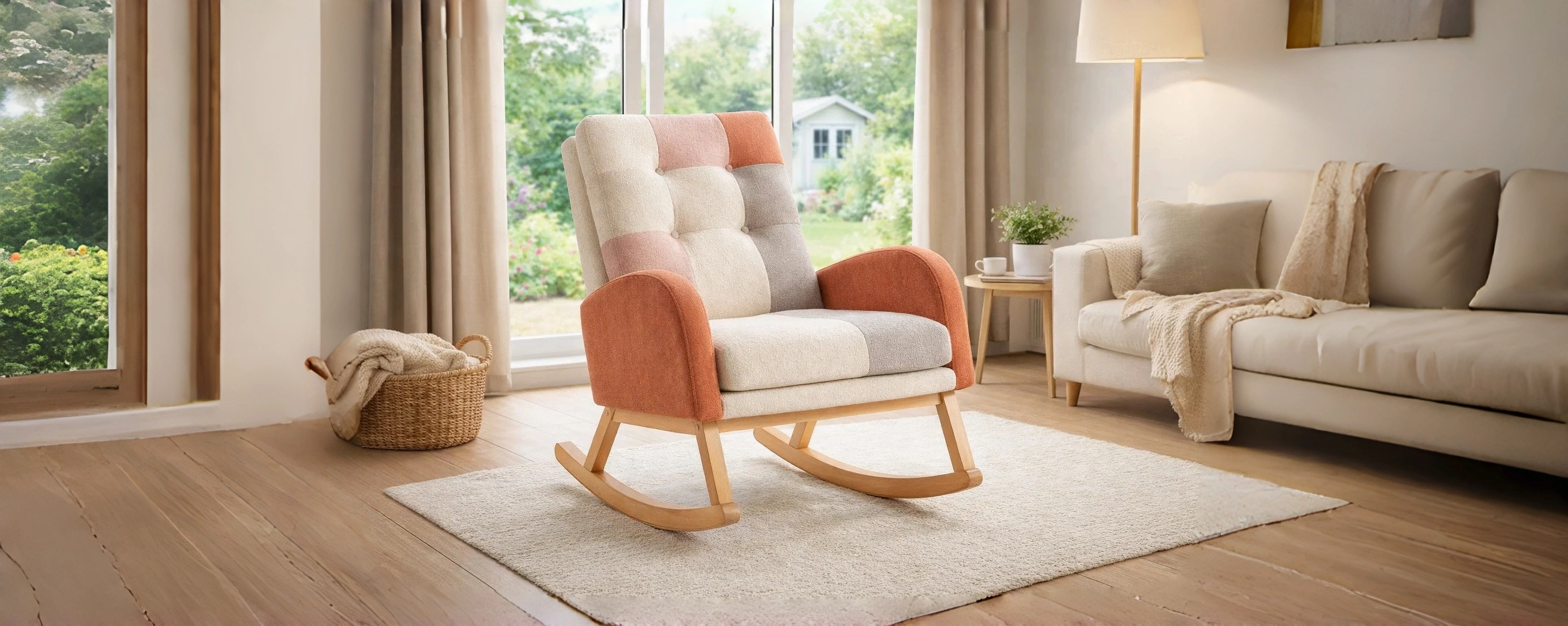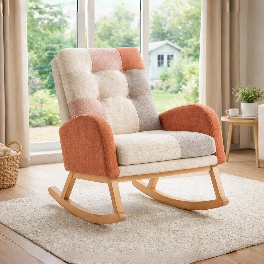 Schaukelstuhl mit Patchwork-Stoff in Beige und Terracotta. Gestell aus Massivholz, geeignet für verschiedene Wohnbereiche.